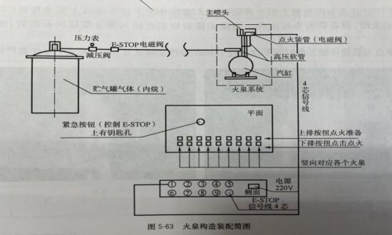 (1)將火噴泉系統(tǒng),氣罐,E-STOP閥門,減壓閥門連接起來的管路一般采用無縫鋼管,連接完成之后必須進(jìn)行試壓以保證安全。尤其要注意連接到火噴泉系統(tǒng)的管路尺寸,采用內(nèi)徑25管,其余部分可根據(jù)現(xiàn)場情況,適當(dāng)小一些無礙。
