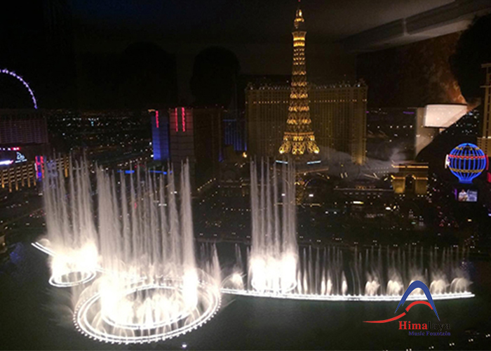 噴泉座落于拉斯維貝拉焦酒店門(mén)前面積達(dá)32,000平方米的巨型人工湖,占地12公頃,容量50萬(wàn)加侖,1214個(gè)噴水孔,超過(guò)5000盞燈光,噴嘴可把水噴到76米。每年都吸引了相當(dāng)多的游客。全部由美國(guó)水景設(shè)計(jì)公司(Wet design)設(shè)計(jì),1998年10月完工。每天也有不少游客慕名前來(lái)觀看。